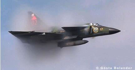 A SAAB JA37 VIGGEN is shown passing the soundbarrier. Pilot: Captain Anders